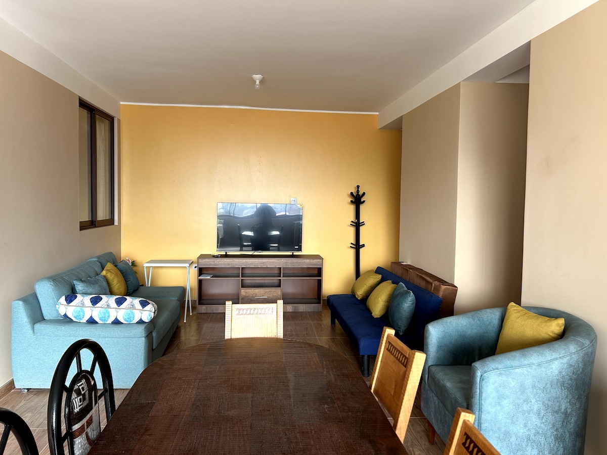 Depa de estreno, moderno y lujoso. Cuenta con 3 habitaciones: una con cama king, otra con cama de dos plazas y una con cama de 1.5 plazas. Tiene 3 baños, cocina totalmente equipada, sala comedor, lavandería y cochera. Ubicado en edificio moderno de cinco pisos. Ideal para quienes buscan comodidad, lujo y un espacio bien distribuido.
