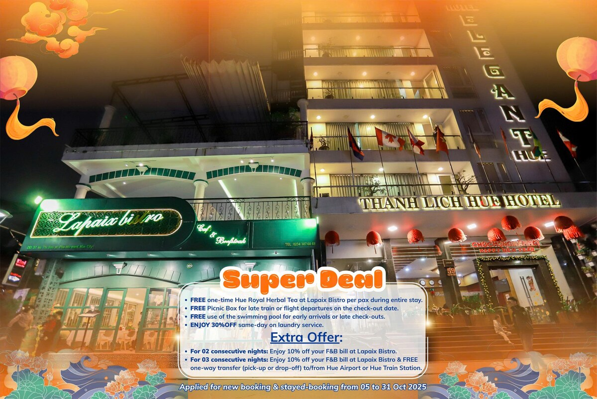 Recibirás una oferta durante la estadía de la siguiente manera: - Desayuno buffet gratuito por persona por día. - Bebida de bienvenida a tu llegada. - Botella de agua mineral gratuita por día por habitación. - Uso gratuito del gimnasio, la piscina cubierta, el club infantil. - Entrada gratuita de una sola vez para el té de la tarde de 5:00 p. m. a 7:00 p. m. por estadía. Otro acceso: - Obtén un 5 % de descuento en masajes corporales o un 20 % de descuento en la Hora Feliz. - Sunrise Lounge - Bar Sky en la azotea en el piso 15 - Alquiler de motos - Recogida en el aeropuerto de Hue, recorrido por la ciudad
