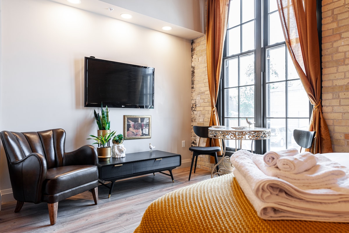 Loft Marrakech: encanto exótico en los lofts Bradshaw de Stratford. Descubre el Marrakech, un impresionante loft de 2 dormitorios que combina el encanto histórico de la arquitectura de 1902 con la vibrante esencia del Magreb del Viejo Mundo. Disfruta de ladrillos vistos, acabados modernos y arte original. Totalmente equipado con una cocina y un lavadero, se encuentra en el corazón del centro de la ciudad, a pocos pasos de los teatros del Festival de Stratford, tiendas y el lago Victoria.
