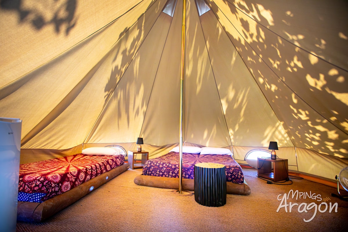 Acogedora Bell Tent, pensada para quienes valoran la tranquilidad y los pequeños detalles. Perfecta para 2 o 3 personas, con cama doble, cama individual y espacio suficiente para descansar cómodamente. Forma parte de un espacio ecológico rodeado de árboles, donde la desconexión está garantizada. En el exterior podrás disfrutar de una zona íntima y privada, donde podrás descansar, tomar un picnic o simplemente relajarte. Baños compartidos y un ambiente pensado para disfrutar sin prisas.