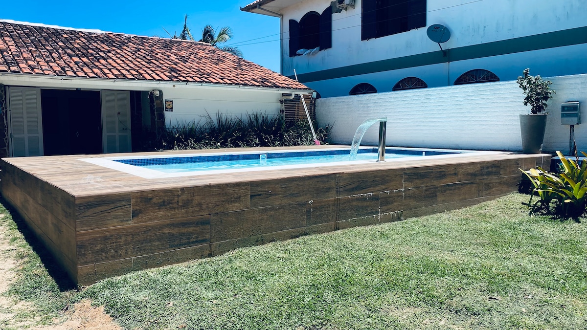 casa bien ventilada, con tres dormitorios con camas dobles, barbacoa, piscina, garaje, todo vallado, calle pavimentada, lugar tranquilo. la distancia hasta la playa sería de 430 metros. Cuenta con monitoreo electrónico para la seguridad total de los huéspedes.