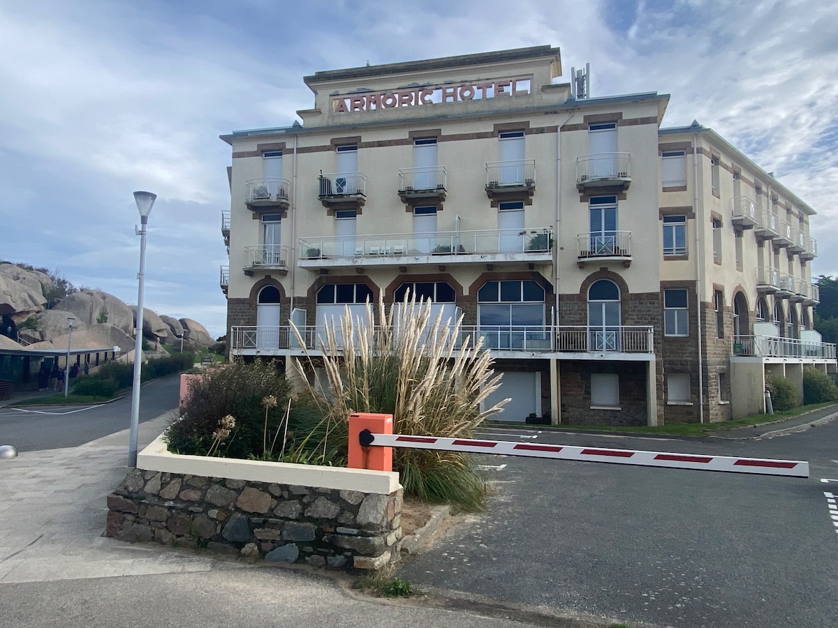 Wide angle on the sea for this exceptional apartment with breathtaking views located on the 1st floor of a former seaside hotel overlooking the beach of Trestraou and the Archipelago of the 7 islands. A little paradise under the palm trees! Private access to the beach and direct to the coastal path If your dates are already reserved, we offer you an apartment on the 5th floor / le5emecielperros on this site Please exchange with the "contact the host" tab for more info A setting out of the world!