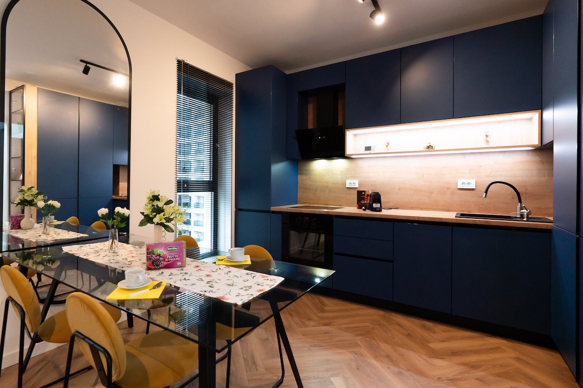 Moderno apartamento de 2 habitaciones en la Torre Aviației, junto al Museo de la Aviación. Elegante diseño contemporáneo, acabados prémium. Amplio dormitorio + cómodo sofá cama. Smart TV, Netflix y wifi de alta velocidad. Cocina totalmente equipada Aparcamiento privado y seguridad las 24 horas, los 7 días de la semana. A minutos del centro comercial Promenada y de los principales centros de negocios. Acceso rápido al parque Herăstrău y al aeropuerto. Check-in flexible para una estancia cómoda.