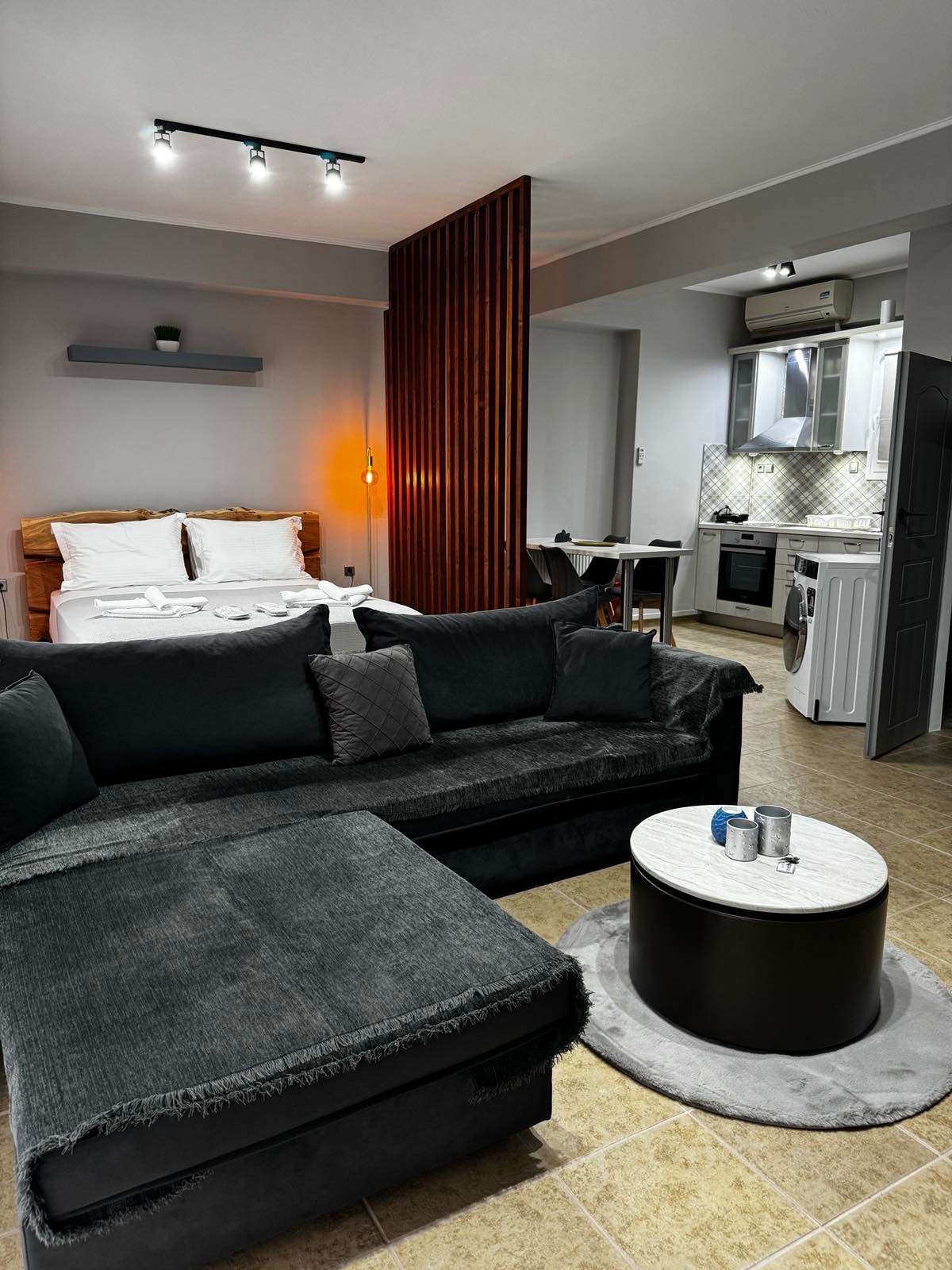 Moderno y nuevo estudio de 45 metros cuadrados con elegante decoración, cómodo sofá de esquina y acogedor dormitorio separado por un panel de madera. Cocina totalmente equipada con electrodomésticos nuevos, lavadora-secadora, aire acondicionado y TV moderna. Un espacio cómodo y bien cuidado ideal para relajarse o para estancias de negocios.