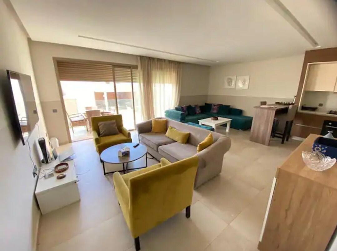 Relájate con toda la familia en este tranquilo apartamento de dos dormitorios, ubicado en una comunidad cerrada en la bahía de Taghazout. El apartamento está en el segundo piso con vistas al campo de golf y al mar. Situado a 4 minutos a pie de la playa. Palos de golf, wifi y Netflix incluidos. Podemos organizar el transporte con un tercero desde y hacia el aeropuerto.