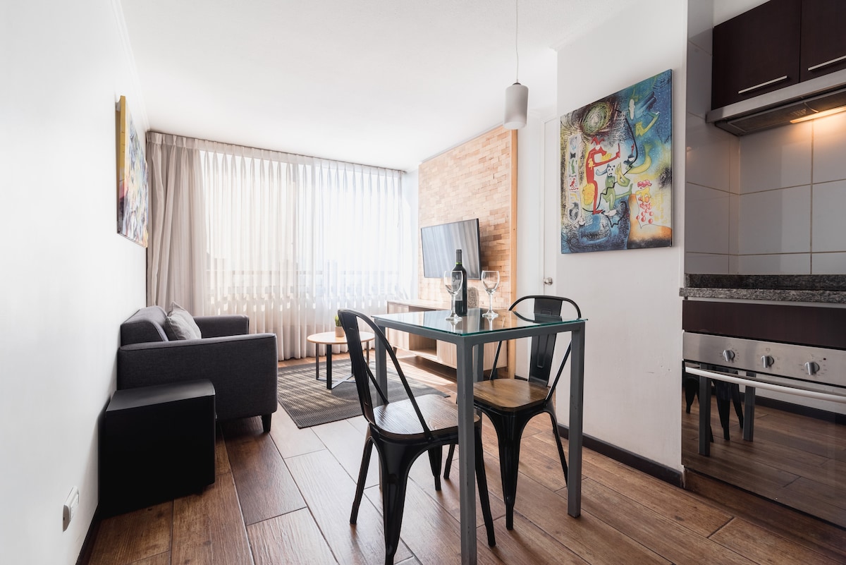 Moderno y acogedor departamento con aire acondicionado en el corazón de Santiago. A pasos del metro y del Centro Histórico, rodeado de museos, mercados y restaurantes. Cama king, cocina equipada, balcón y wifi rápido, ideal para viajes o estadías largas. Edificio seguro con conserje 24/7. Atención personalizada, check-in flexible y recomendaciones locales para que disfrutes la ciudad como un residente, con comodidad y tranquilidad.