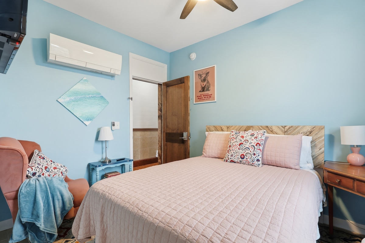Disfruta de una buena noche de sueño en esta elegante y exclusiva habitación. La habitación cuenta con una cama tamaño king y un baño grande con una ducha adaptada para sillas de ruedas lo suficientemente grande para 2 personas. Elige entre el cabezal de ducha tradicional y una unidad de mano. Hay una silla de transferencia para la ducha disponible bajo petición. Fácil acceso, sin escaleras. Wifi gratuito. Televisor inteligente con Hulu Plus, además, puedes iniciar sesión en tus propios servicios de streaming. Para tu comodidad, la habitación cuenta con mininevera, microondas y cafetera.