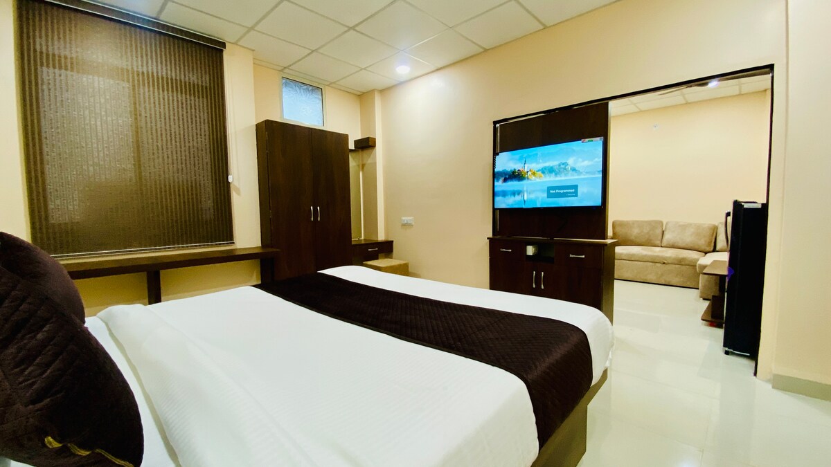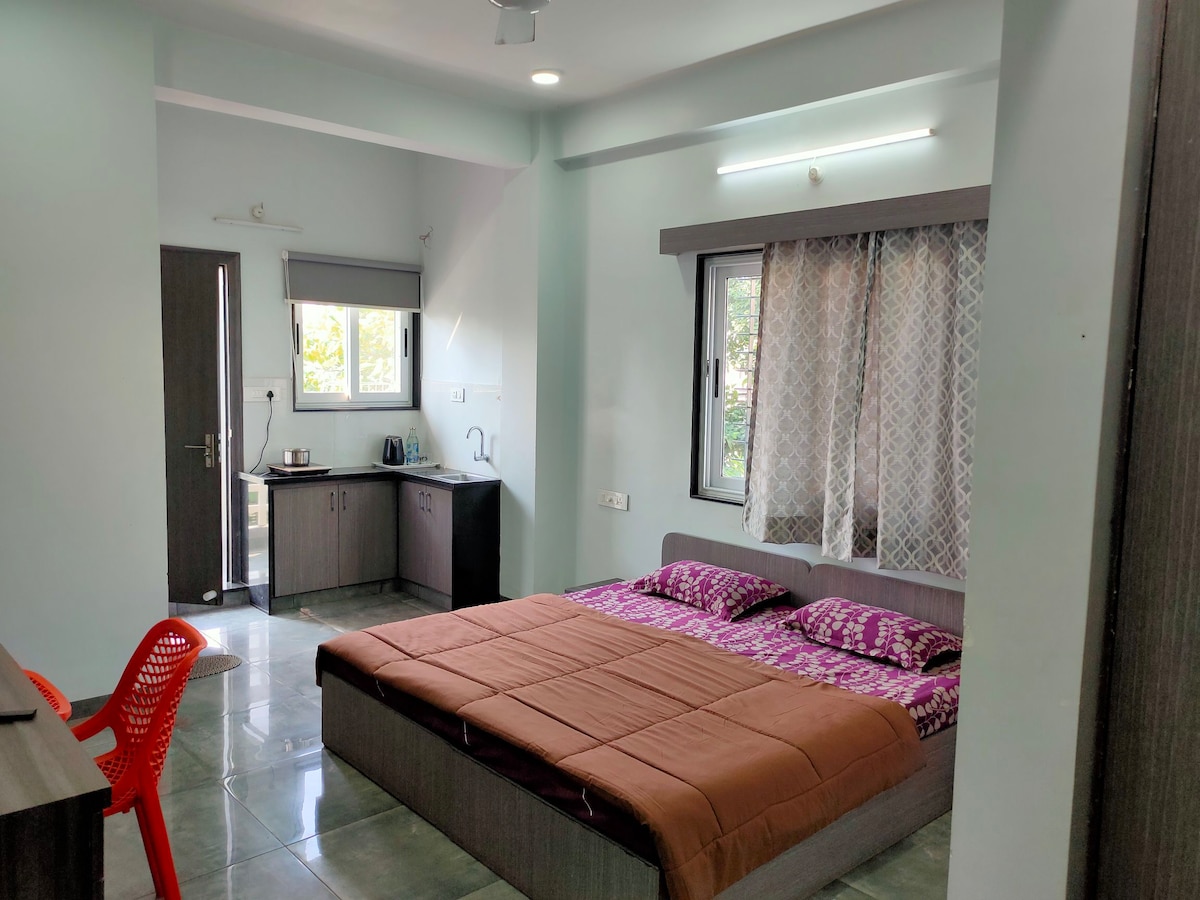 Forget your worries in this spacious and serene space. Relax in this luxurious 375 sq.ft. 1RK designed for premium comfort. Enjoy a private front balcony, fully equipped kitchen with personal RO, and a plush 7’x7’ bed with 8” memory foam mattress. Unwind on the 4-seater recliner sofa, stream on Android TV, and stay connected with free high-speed WiFi. Spacious wardrobe, big dresser, cloth hanger. Perfect for short and also long stays.