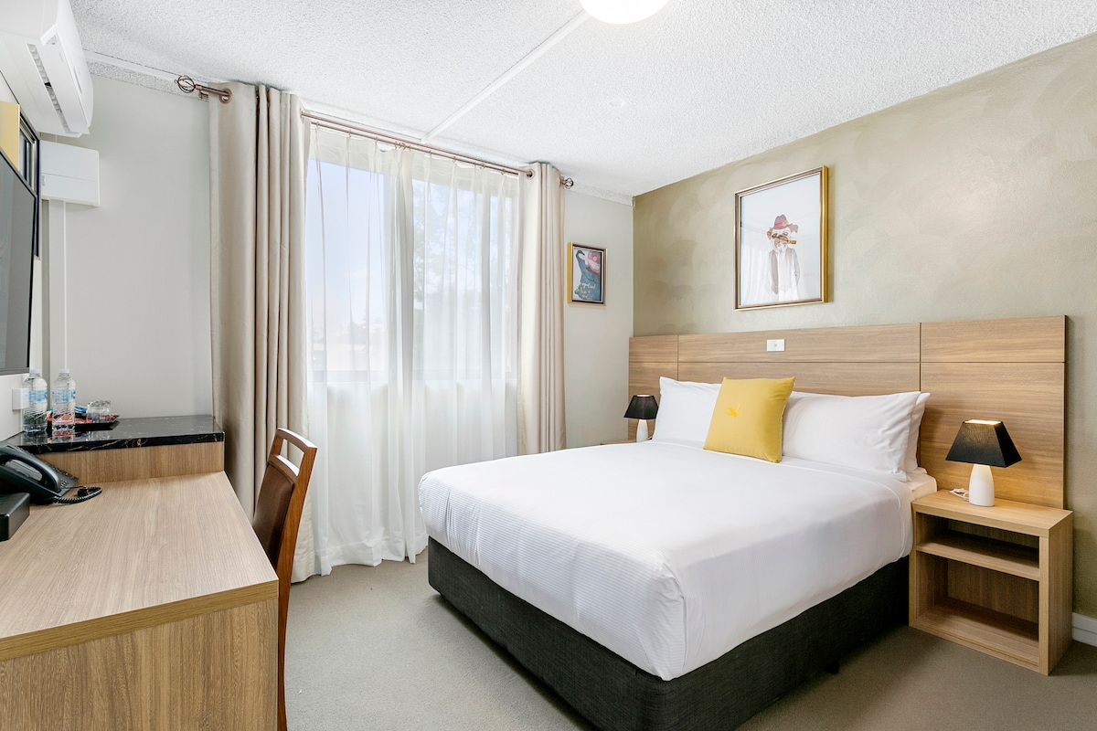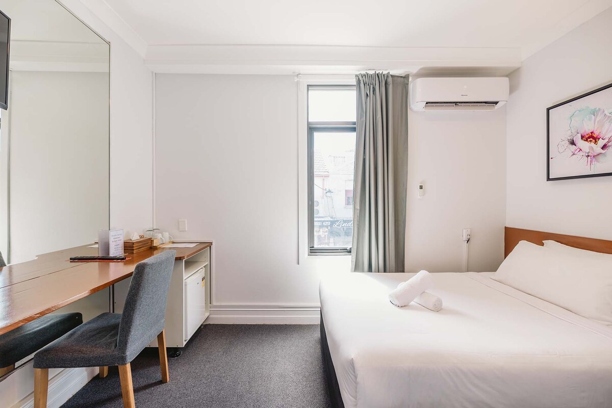 This rooms' facilities and amenities include ensuite bathroom, individually controlled ducted air conditioning, brand new high quality Queen bed ensemble, blockout blinds on windows, Smart TV, free Wifi, free Apotheke toiletries pack including soap, shampoo & conditioner, fresh bed linen and towels. The room is accessible by stairs.