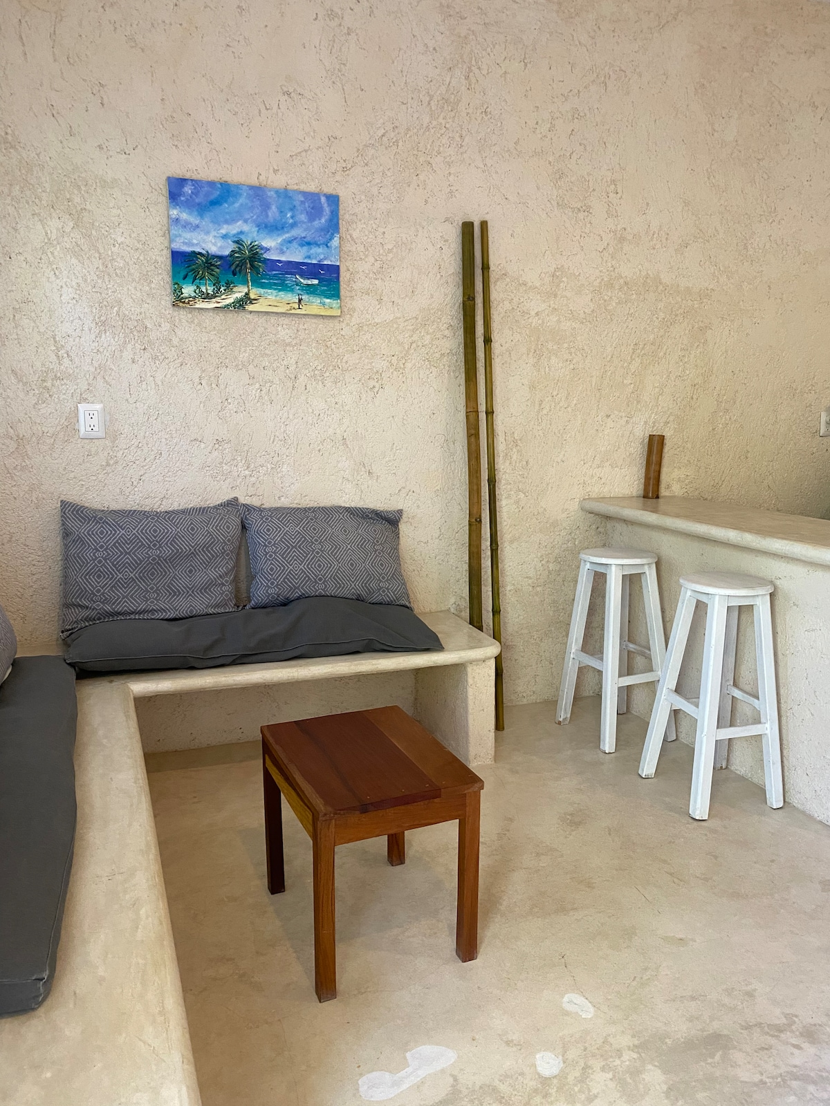 Suite de diseño muy espaciosa elegantemente decorada con muebles locales. Habitación ubicada en planta baja, cuenta con una hermosa terraza privada para disfrutar de las verdes vistas. Cada suite fue decorada individualmente. Cama king size, aire acondicionado, wi-fi gratuito y baño privado. A tan solo 5 minutos caminando a la playa, en La Casa de Mia respirarás tranquilidad, naturaleza y elegancia. Te sentirás como en casa en esta hermosa casa. Renovaciones en la azotea del 10 al 18/23 de mayo
