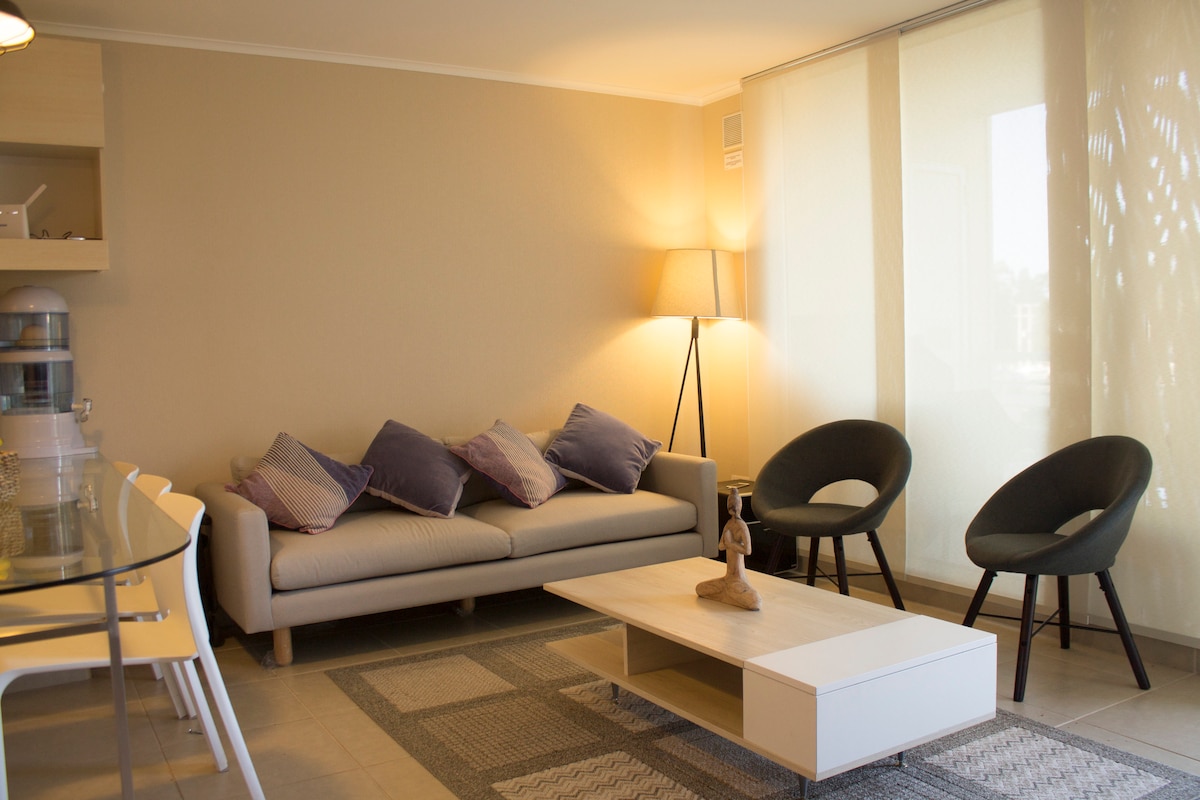 Toallas y Sabanas no incluidas, por higiene Estacionamiento Subterraneo. Depto de 2 Dormitorios con IPTV con Full Canales HD - Mallas de Seguridad - Wifi Fibra Optica. Agua Purificada Hola! Nuestro depto consta de 2 dormitorios y está ubicado en un segundo piso con vista libre a la nueva piscina de la laguna ( mucho más tranquila). Depto muy tranquilo ya que está separado de las otras 5 torres. Es especial para familias con niños pequeños por la cercanía visual con el área de la piscina