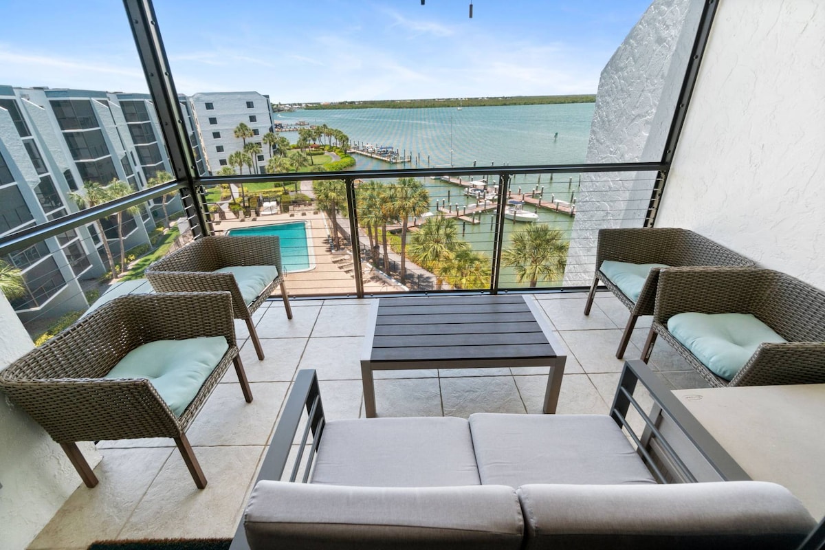 This beautifully appointed one bedroom Riverside Club condo offers waterfront living at its finest! The exterior entry and open-air stairway, make it possible to avoid any enclosed public spaces when accessing this sixth floor unit (an elevator is available). Inside, you will appreciate the open floor plan and updated furnishings and decor while marveling at the lovely views of the Marco River.