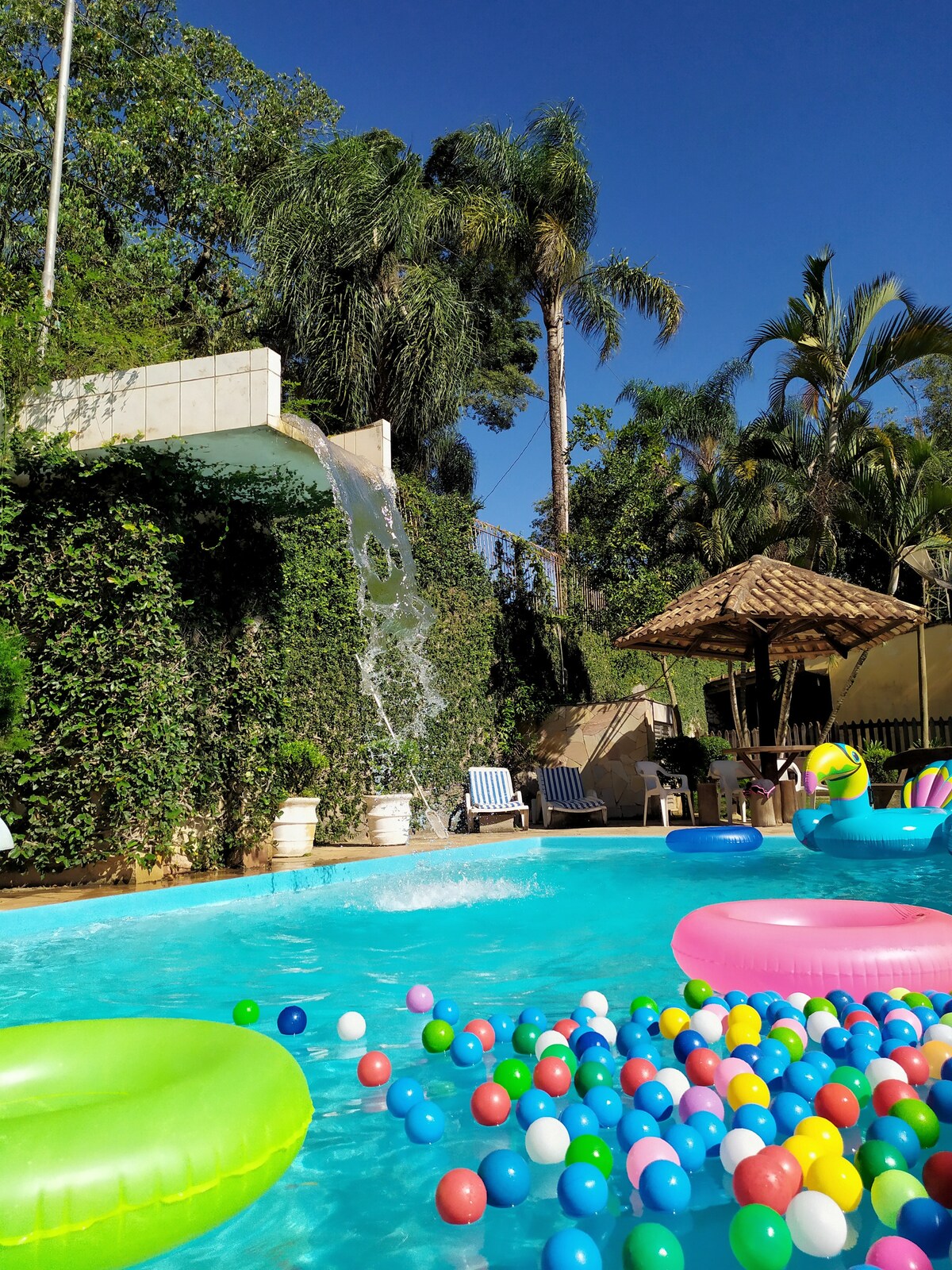Piscina climatizada - Parque infantil Casinha de boneca Casinha do Tarzan Balança Red para jugar a voley en el césped Campo de Futebol Tenis de playa. Fazendinha con caballos, ponys, conejos, pollos, pavo real Lago de pesca deportiva Parrilla Horno de pizza Horquilla de leña Sitio para incendios 05 suites, (20 personas) con aire acondicionado, TV Sala de estar con TV inteligente Wi-Fi Salidas 110v Cocina completa. Tenemos un diarista Área toda el césped, plano Condomínio Fechado