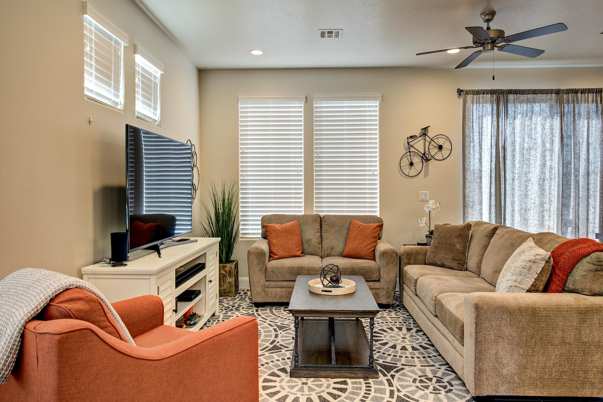 Disfruta reuniendo a toda la familia en esta hermosa escapada de coral rojo. ¡Se admiten mascotas! El espacio cuenta con un comedor luminoso y abierto con un montón de cómodos espacios y sofás. Es perfecto para reunir a la familia después de un evento en St. George o un largo día de senderismo en el Parque Nacional Zion. Después de un día completo, disfruta de un chapuzón en la piscina o de un baño en el jacuzzi para calmar los músculos doloridos.
