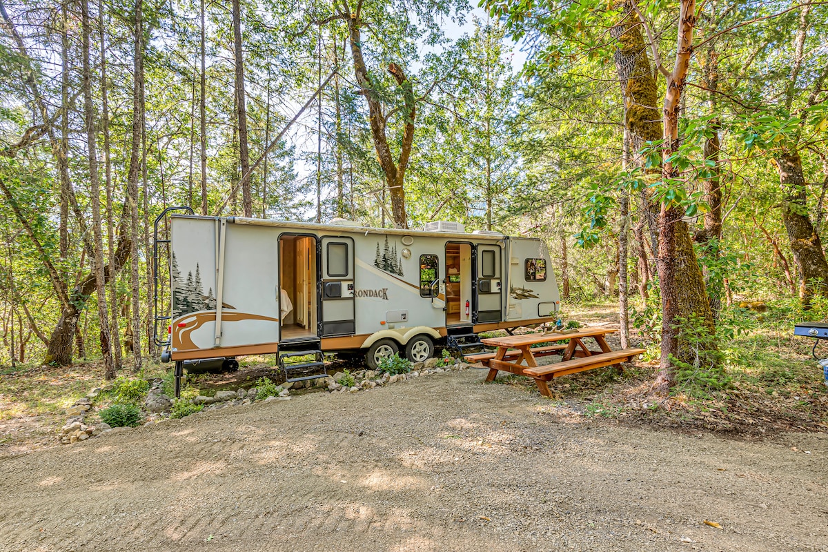 Privacidad y un pedazo de paraíso, en el río Upper Applegate Esta es una escapada maravillosa para dos o tres, con 900 pies de frente privado al río Applegate. Puedes sentarte en tu porche privado y escuchar el río que fluye, escuchar el canto de los pájaros, observar la vida silvestre, pescar en el río y contemplar las estrellas desde nuestra bañera de hidromasaje al aire libre. Esta caravana de una quinta rueda de 36 pies se encuentra en 2 acres de terreno, a solo unos pasos del río Applegate, rodeado por el bosque nacional de Siskiyou.