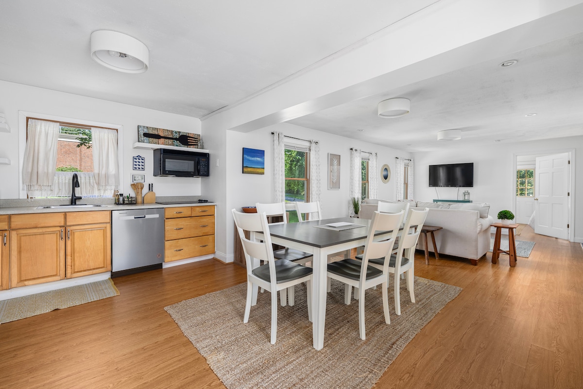 Este lugar tranquilo y céntrico es una casa de campo moderna, soleada y espaciosa de un dormitorio ubicada en el corazón del histórico Wakefield. Estamos a pocos minutos de muchas playas de Rhode Island. Pasea cuesta abajo hasta un encantador parque en el río Saugatucket y luego cruza la encantadora pasarela hacia la ciudad. Aquí encontrarás una gran variedad de restaurantes, cafeterías y heladerías, además de un excelente teatro comunitario, yoga y tiendas interesantes. Relájate dentro de esta casa llena de luz o siéntate en la terraza con vistas a los jardines y la ciudad.