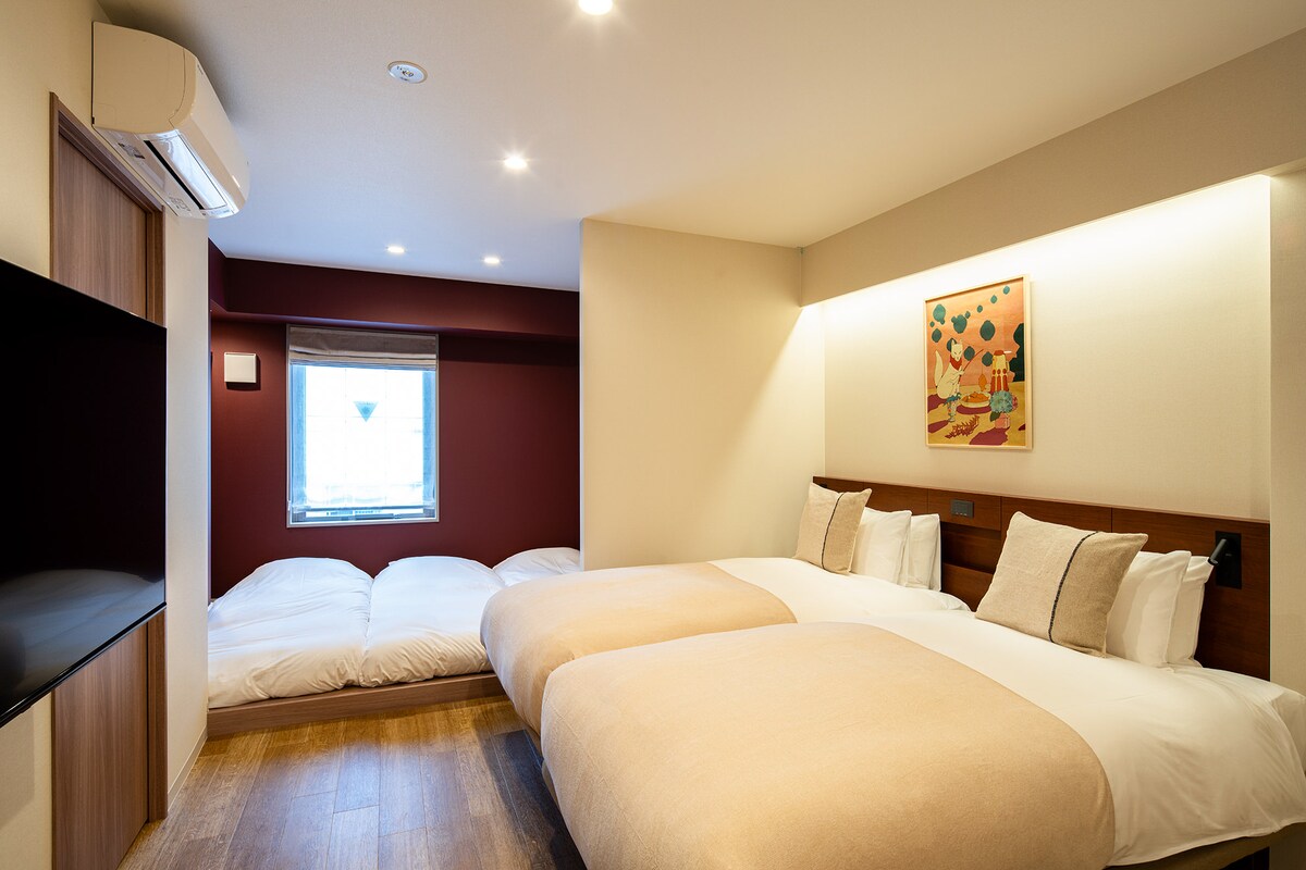 Es conveniente para toda la familia ir a cualquier lugar en este lugar céntrico. La habitación está equipada con dos camas king, por lo que es ideal para familias y grupos de amigos. La separación entre las camas es cómoda y la distribución permite mantener la privacidad.Adecuado para que duerman hasta 5 personas. La cocina abierta está equipada con una estufa de inducción, ollas, sartenes y platos, por lo que puedes cocinar fácilmente comidas caseras o platos japoneses sencillos. La barra del bar conecta la sala de estar y el comedor, por lo que es perfecta para cualquier cosa, desde un café por la mañana hasta una cena por la noche. El lavabo y el baño están diseñados por separado, por lo que, incluso si varias personas se alojan juntas, cada una puede seguir su propio ritmo. Proporcionar estéreo Bluetooth, escuchar música y tomar un baño caliente por la noche en Japón es el momento más relajante del viaje. La habitación está equipada con un proyector que se puede conectar fácilmente a las plataformas de streaming digital más populares. Totalmente equipado con lavadora, purificador de aire, plancha y un armario espacioso; tenemos todo lo que necesitas. El espacio es ideal, perfecto para que una persona trabaje tranquilamente en la barra del bar o para pasar unos días con amigos o familiares. Nos lo pasamos muy bien y todos se sintieron cómodos.