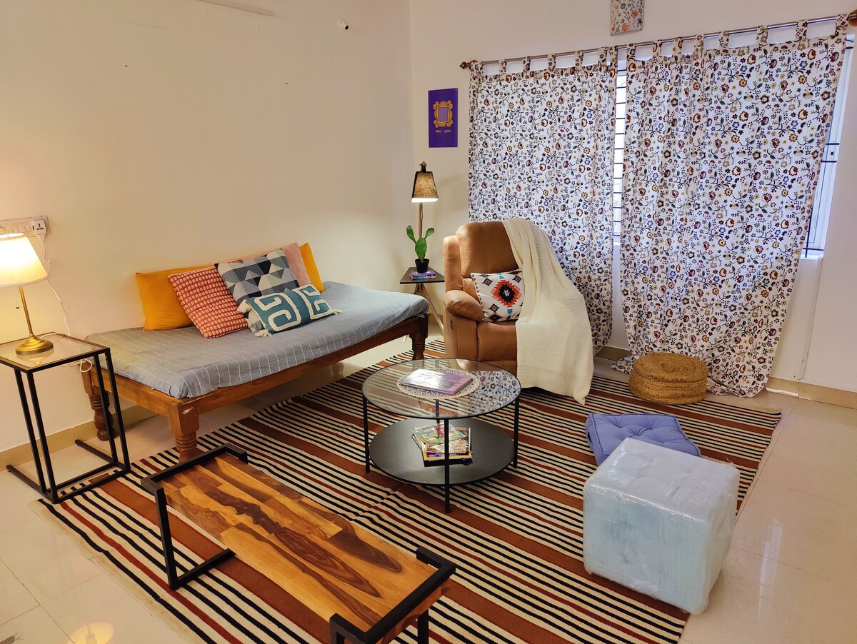 ¡Te damos la bienvenida a tu base de compras perfecta durante la temporada de bodas! Esta encantadora y acogedora casa está diseñada cuidadosamente para que los huéspedes que visitan compren ropa de novia, trajes étnicos, trajes occidentales y joyas exquisitas. Situado en el corazón del bullicioso distrito comercial de Jayanagar, estás a pocos minutos de boutiques de diseñadores, joyerías y vibrantes mercados locales. Después de comprar todo lo que quieras, vuelve a descansar en nuestras camas suaves y cómodas y relájate con comodidad.