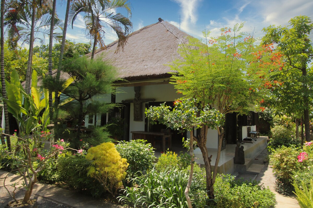 Villa Ramah Tamah es una pequeña y acogedora villa con techo de paja situada junto al mar en Lokapaksa (norte de Bali). La casa está escondida en un exuberante jardín tropical y construida en una parcela de 10 áreas. Cuenta con 2 dormitorios, el dormitorio principal es un «dormitorio abierto» con baño privado y «baño abierto». No está al aire libre, pero ambos no tienen puertas ni techos. Por lo tanto, tienes una vista directa a la construcción del techo de paja.