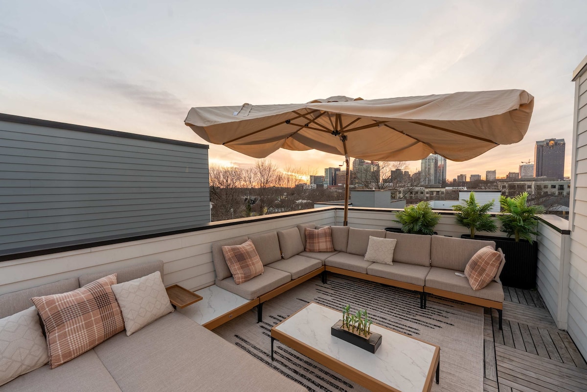 Esta impresionante casa adosada de 3 dormitorios y 3,5 baños en el centro de Raleigh ofrece comodidad, espacio y estilo de alta gama para 6 personas. Disfruta de una terraza privada en la azotea con 2 fogatas, parrilla y vistas a la ciudad. Cada dormitorio tiene su propio baño privado, y la sala de estar de concepto abierto cuenta con una cocina de chef, chimenea de gas y Smart TV. Con estacionamiento en garaje, ascensor y acceso peatonal al anfiteatro Red Hat, restaurantes y cervecerías, este es el alojamiento perfecto para viajes de negocios, escapadas familiares o fines de semana de conciertos.