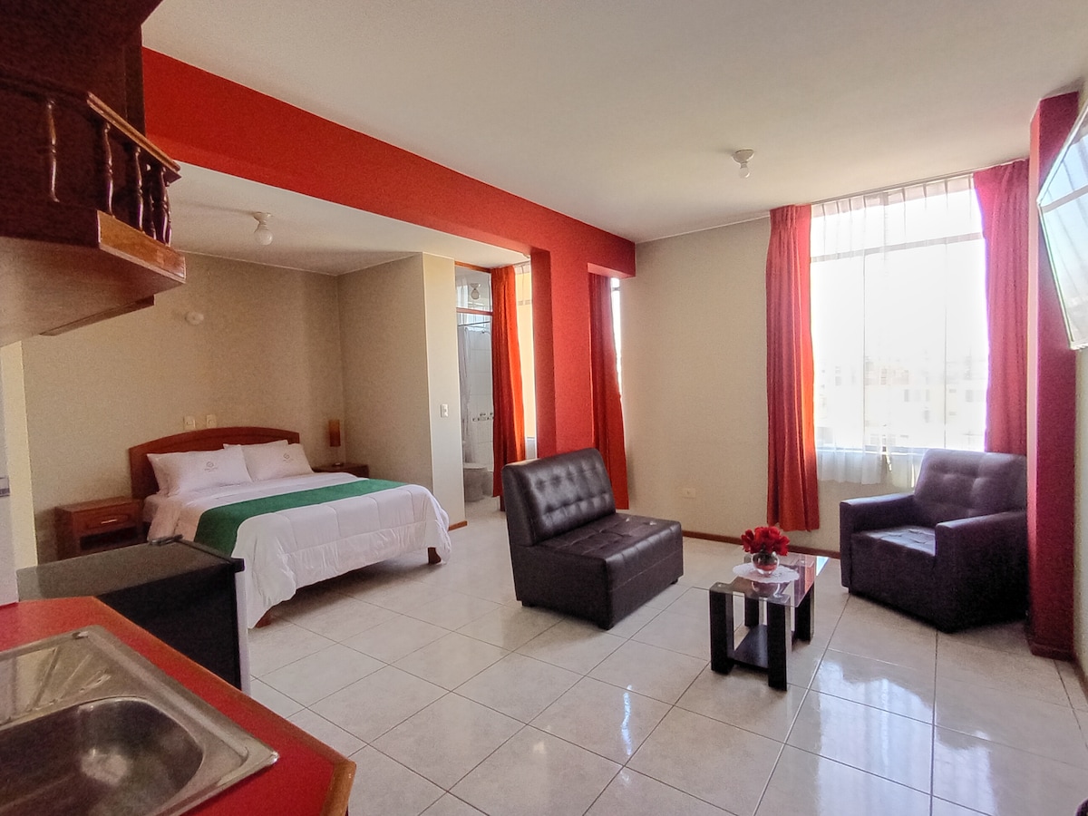 Esta habitación moderna y sofisticada mide 15 mt2, está equipada con una cama Queen con box spring, alfombra, TV de pantalla plana de 42 pulgadas, frigobar, caja fuerte, secador de cabello (a pedido), teléfono y baño privado con artículos de aseo gratuitos. Se proporcionan edredones de plumas y ropa de cama de la más fina línea hotelera. En las áreas públicas contamos con recepción 24 horas, lavadora, cocina, comedor y terraza. NO INCLUYE DESAYUNO (costo adicional)