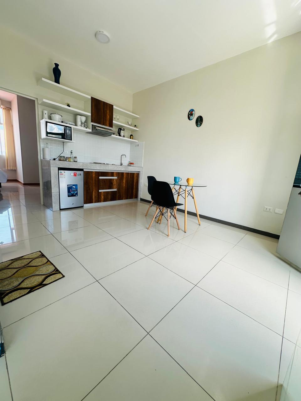 Este piso está acondicionado para un soltero o pareja . Se encuentra en el Cuarto piso de una edificio residencial . Tiene una pequeña terraza y abajo del edificio está el Café Runa que es como tener tu propio café , hay todo lo que necesites cerca carnes , bodegas , licorerias y farmacias ; los clásicos maduritos rellenos, el Gimnasio Prime y hasta una notaría . Tiene todo lo esencial . Aire acondicionado , sofá de Cuero ,menaje completo ,