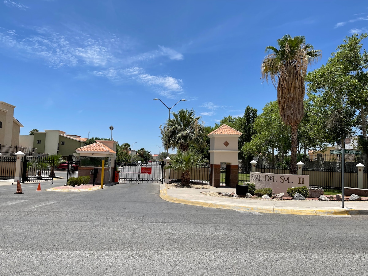 Mi espacio te encantará, sobre todo por la tranquilidad que aquí se respira, la casa es pequeña, pero muy funcional, cuenta con baño completo en cada habitación, más un medio baño. Dos accesos al fraccionamiento, por lo que se acomodan a tus necesidades, seguridad controlada y tiendas de conveniencia y comida a la vuelta de la esquina. Puente internacional Zaragoza a 5 min y a 10 mins del consulado. Puedes transportarte en Uber o transporte público.