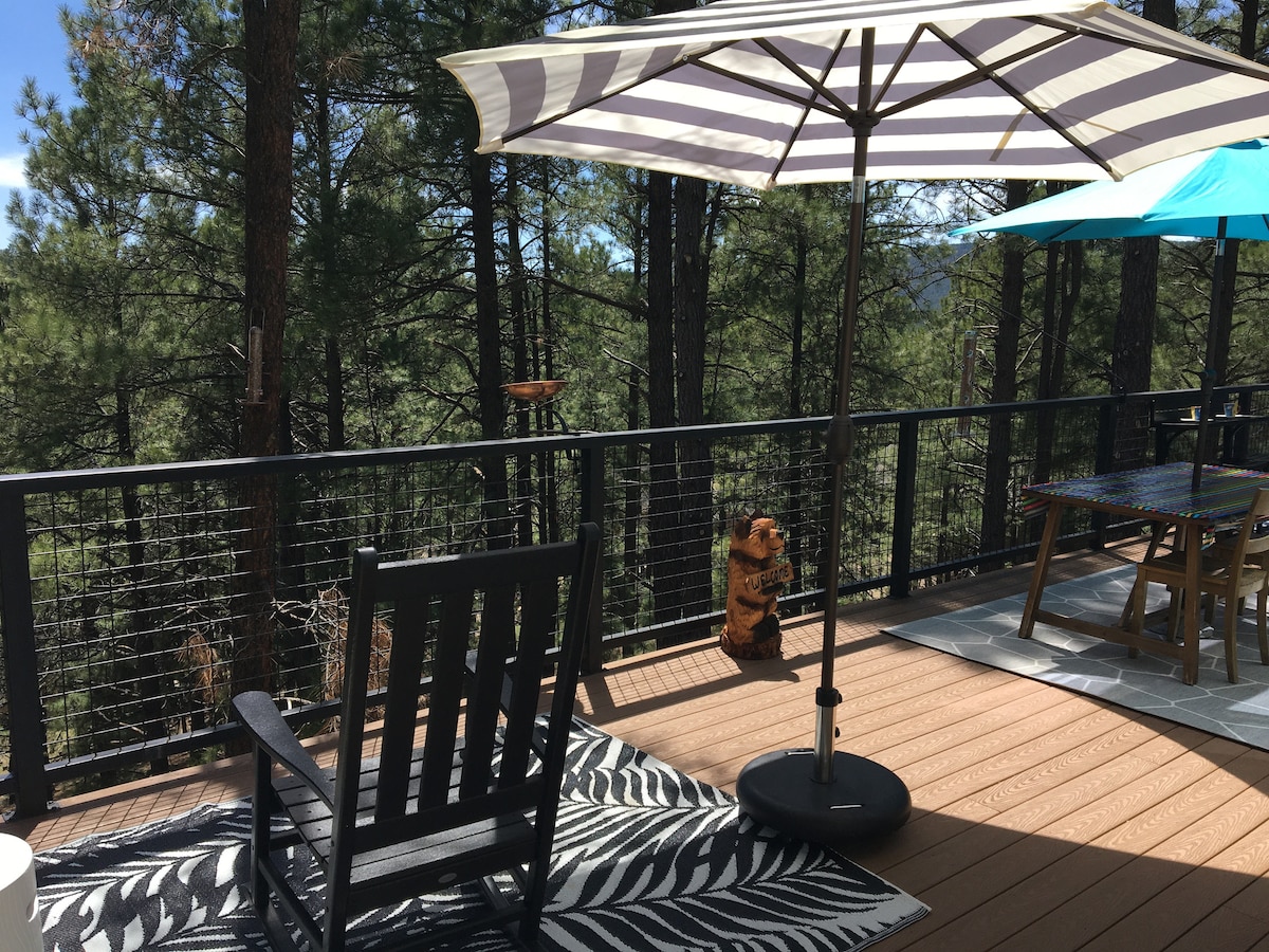 Alojamiento cómodo cerca de Flg y Sedona. Disfruta de un jacuzzi al aire libre entre los pinos en este apartamento limpio, acogedor, espacioso y privado en el sótano de mi casa. El barrio boscoso está a diez minutos al sur de Flagstaff. Visita Sedona, Snowbowl y Grand Cnyn. Hermosa luz natural en todas partes. Relájate en el jacuzzi al aire libre (se requiere antes de la ducha, batas en el armario) o dentro en el columpio único del sofá. Gran colchón tamaño king y ropa de cama acogedora. Barrio agradable con hermosas caminatas por el bosque. Cocina completa