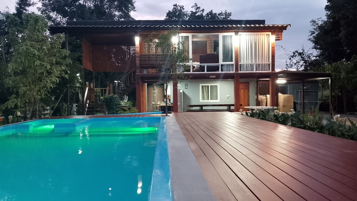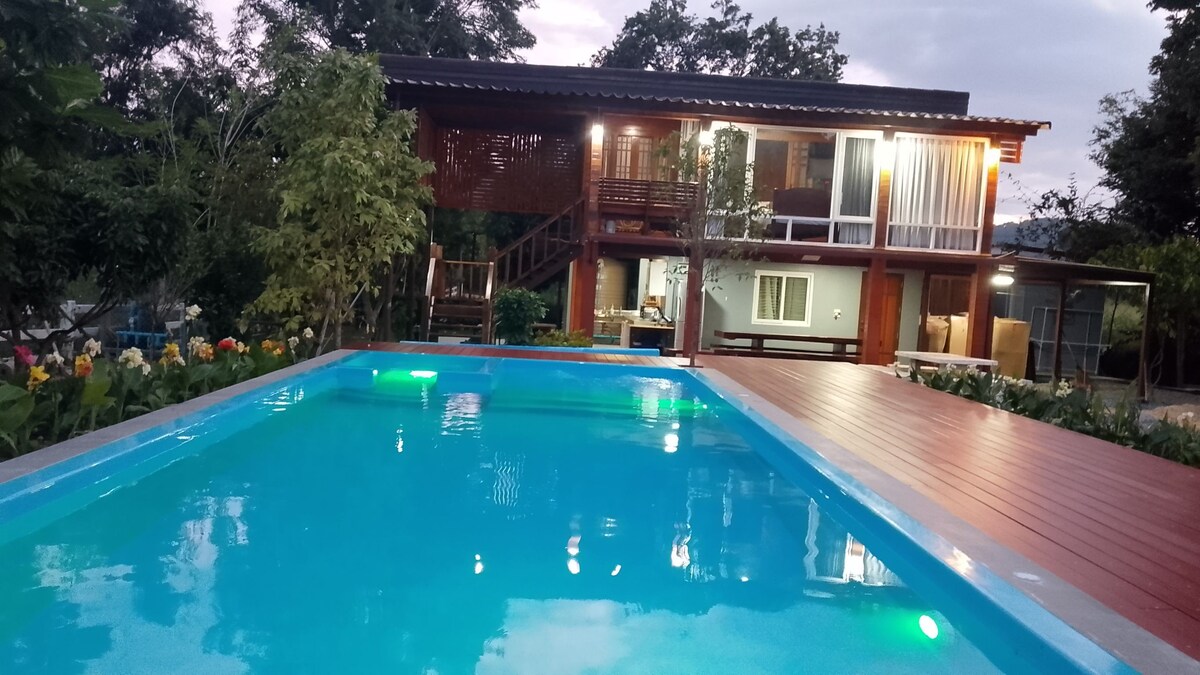 "IRINDARA" es una casa de madera de teca privada, cálida y acogedora grande con un césped privado grande (más de 14 rai/ 5,5 acres) que está justo al lado de un arroyo fluvial. Ideal para un grupo de familiares y amigos que quieren disfrutar en privado de las escenas de montaña y acercarse a la naturaleza. A 5 minutos en coche del restaurante Dairy Home y de las tiendas de conveniencia locales. A 30-40 minutos en coche del Parque Nacional Khaoyai.