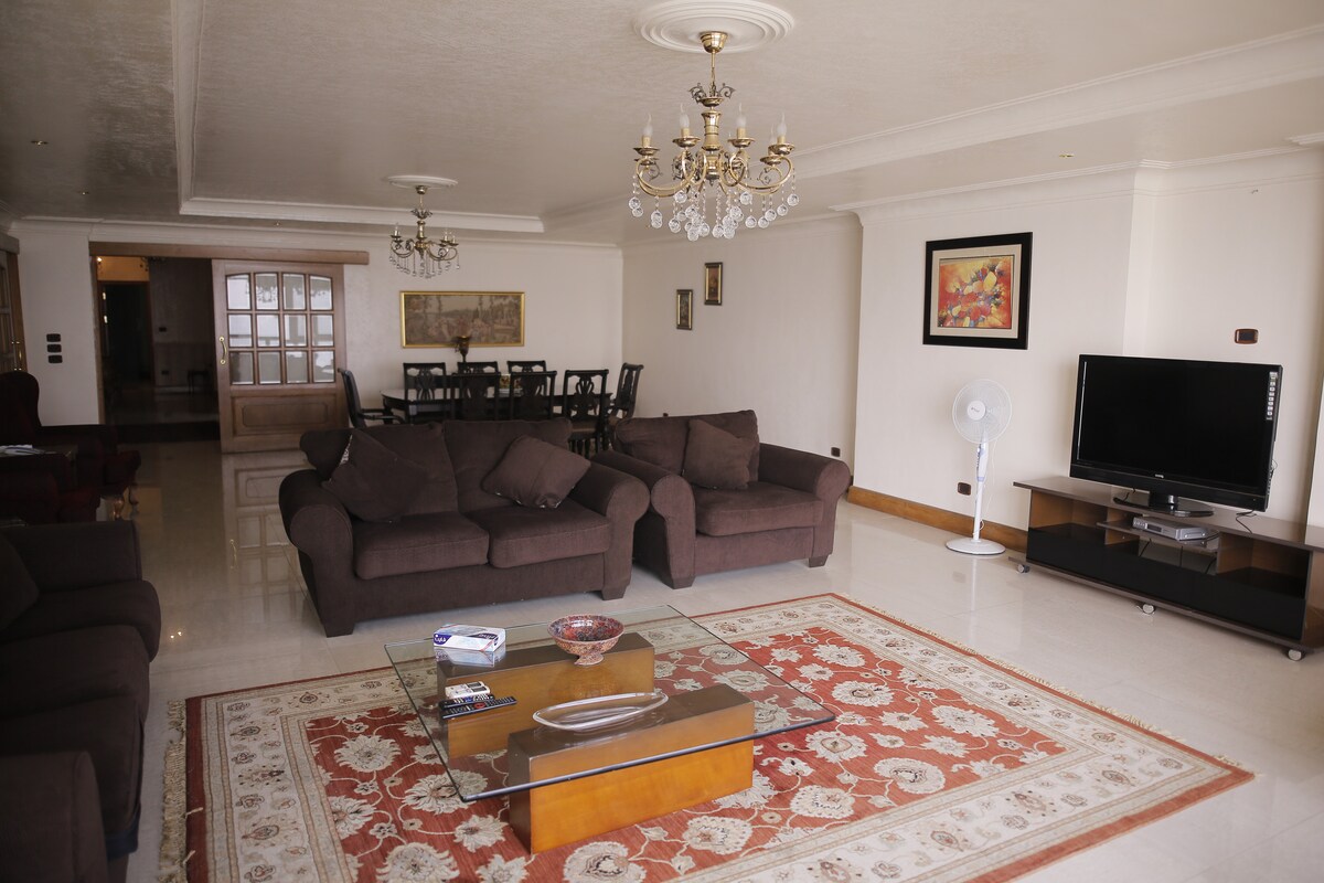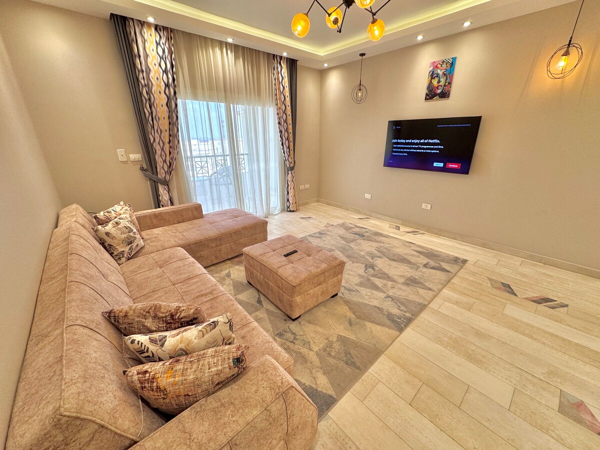 ¡Hospédate 10 noches y disfruta de un paseo en faluca por el Nilo gratis! Centro de la ciudad de El Cairo, perfecto para negocios o placer. Nuestra propiedad recientemente renovada cuenta con un diseño luminoso y acogedor con grandes ventanales e impresionantes vistas al golf y a la ciudad. En el interior, una cómoda sala de estar y comedor, una cocina moderna con electrodomésticos de alta gama, elegantes dormitorios con baño en suite y un estudio/oficina versátil. A pocos pasos, tienes acceso gratuito a un gimnasio, piscina, jacuzzi, salón y parque infantil.