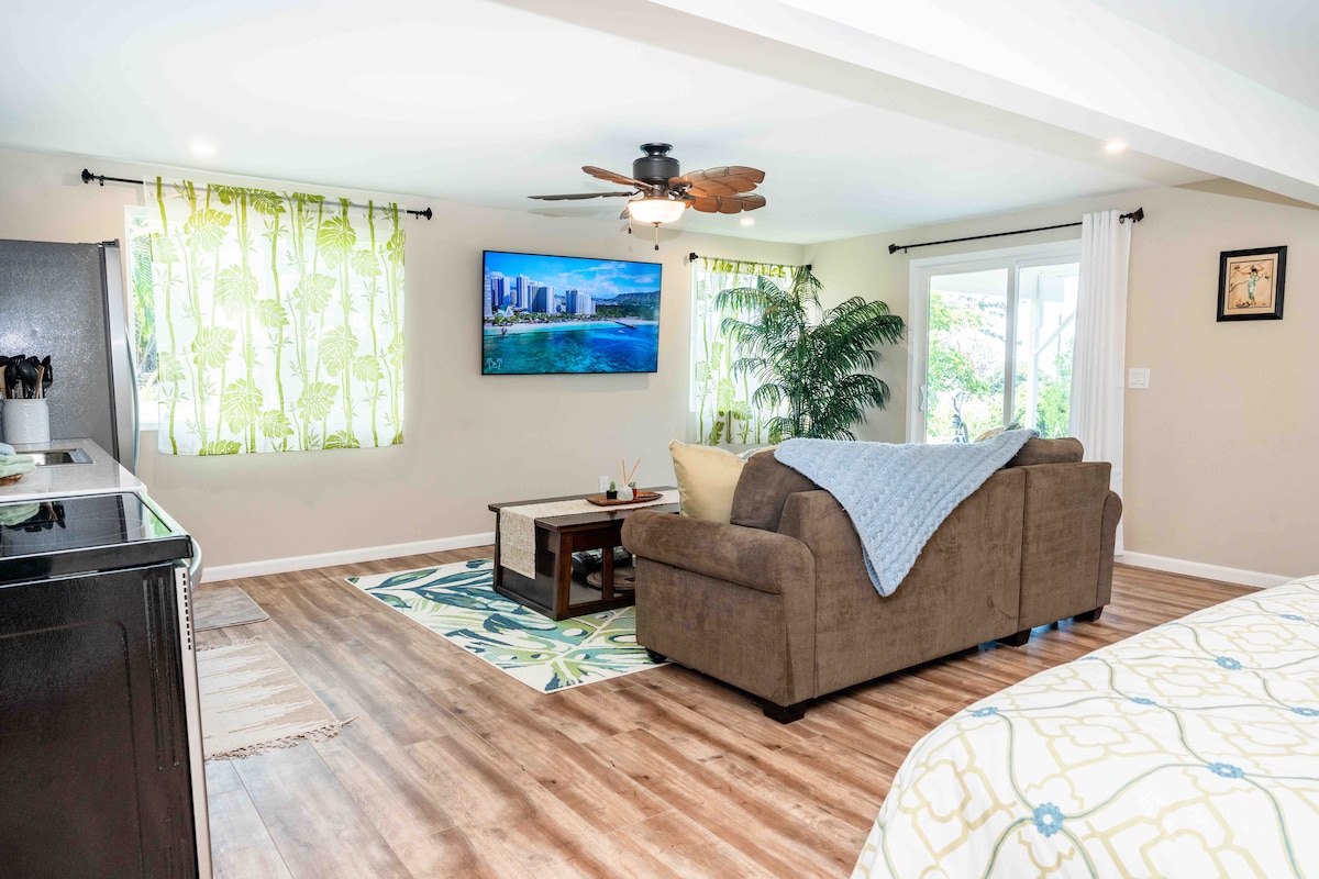 ¡Aloha, bienvenido a mi acogedora ohana! Ubicada a pocos minutos del aeropuerto y de algunas de nuestras playas más bonitas. Tiene 1 cama tamaño queen más un sofá. 2 vestidores. La cocina incluye nevera completa, microondas, horno tostador y placa calefactora. Hay wifi gratuito y una televisión inteligente para que puedas ver tu propio Netflix, Hulu, etc. Entrada privada y, oh, sí, la mejor parte... ¡aire acondicionado! Impuestos incluidos.