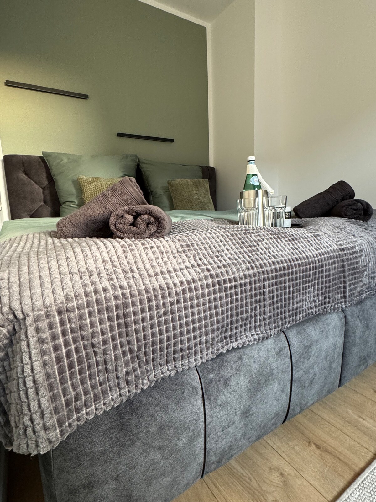El bonito apartamento de 1 habitación con decoración moderna tiene una entrada independiente, una cama grande (140x200 cm), sofá, armario blanco de Ikea, mesa de comedor con 2 sillas, televisor de pantalla plana, cocina con microondas (aire caliente), cafetera, Tchibo Cafissimo, tostadora, hervidor de agua, vajilla, baño, ducha, armario con espejos, mueble bajo lavabo, conexión a Internet, persianas eléctricas en el salón/dormitorio y en el baño. Se proporciona secador de pelo, jabón de manos, champú, toallas y ropa de cama.