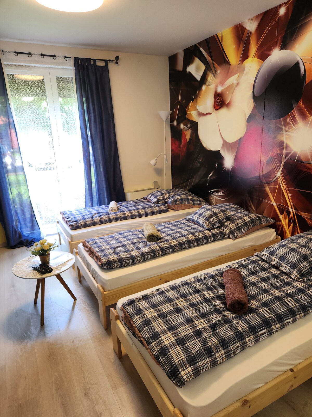 Apartamento moderno, elegantemente amueblado en planta baja de 40 m2, a pocos minutos a pie del centro de la ciudad, lugares de interés, estación de tren y autobús. Muchos restaurantes, pastelerías, cafeterías, tiendas de comestibles están a pocos pasos del mercado del centro de la ciudad y de un gran parque. La amplia habitación tiene dos camas dobles, una de las cuales se puede plegar según sea necesario. También hay una mesa de comedor, una mesa de centro y una mesa de escribir una computadora portátil.