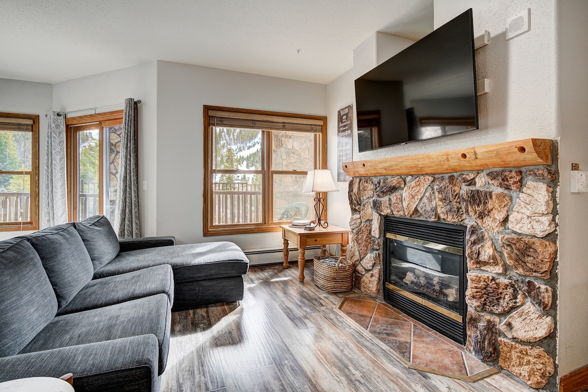 ¡Bienvenido a nuestro luminoso apartamento de 1 dormitorio en el corazón de River Run Village (Keystone Mountain)! ¡Evita los autobuses hasta los remontes, ya que este apartamento está a 3 minutos a pie de la telecabina! Este apartamento tiene capacidad para cuatro personas y cuenta con un dormitorio privado con cama tamaño king, así como una unidad actualizada con encimeras de granito. Disfruta de tu bebida favorita mientras tomas el sol y vistas espectaculares de las pistas, ya sea en el interior calentado por el fuego o en el exterior en tu propio balcón privado.