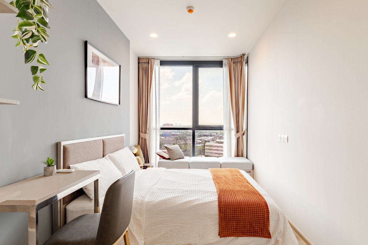 Bienvenido a mi casa, un apartamento superior de estilo hotelero en la ubicación privilegiada: zona de Ekkamai, a solo 200 metros de BTS Ekkamai, con piscina infinita en nube, un dormitorio en el centro de la ciudad, vida conveniente, ¡de alta gama! A 2 minutos a pie de la estación BTS Ekkamai, a 2 minutos a pie del centro comercial Gateway, piscina en la planta superior y gimnasio con excelentes vistas a la ciudad. Esta es una casa privada en el centro de la ciudad, con una superficie total de 35 metros cuadrados (incluido un balcón) con un dormitorio, un baño, un balcón, una zona de estar con sofá y un comedor.