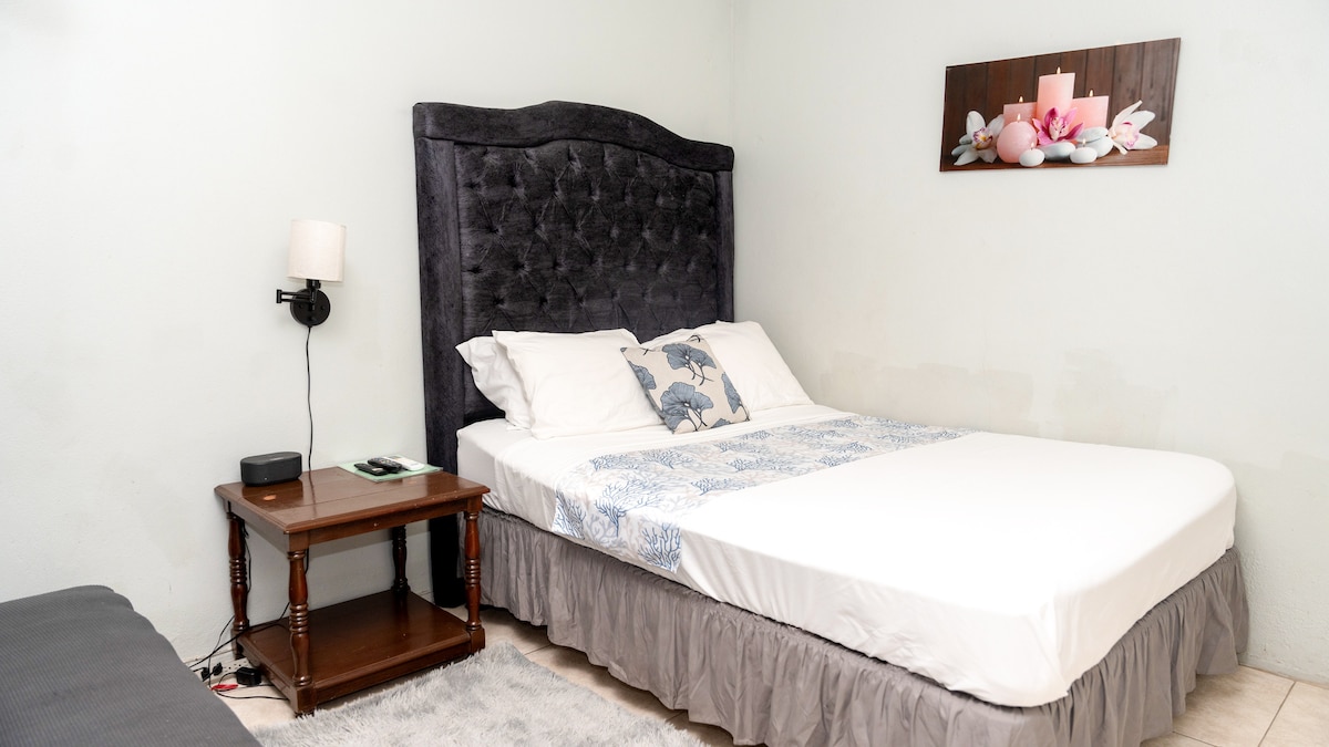 Acogedor dormitorio ubicado en Mona Heights, Kingston, Jamaica. Ofrece comodidades modernas como aire acondicionado, agua caliente, wifi y TV por cable. Una cama Queen size está equipado con sábanas suaves sedosas y una colcha caliente que está seguro de darle una buena noche de descanso. La alarma de cabecera funciona como altavoz Bluetooth. Todas las ventanas y puertas tienen barras antirrobo y nuestros huéspedes tienen acceso a un estacionamiento seguro.
