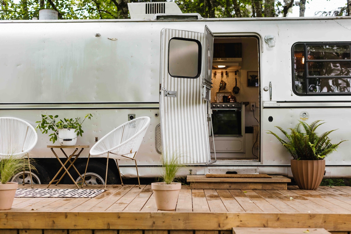 ¡Mejor Airbnb de los 51 mejores alojamientos en Condé Nast ! ¡Una parte de la granja familiar Alexandre, puedes alojarte en nuestro remolque único, romántico, rústico y remodelado Avion vintage 1979! Ubicado justo después de nuestro rancho de huevos y enclavado en los árboles para una total privacidad. "Glamp" en nuestro hermoso rincón de un campo de pollos donde puedes despertar a los cuervos de gallo y las vacas mugiendo, ubicada a solo 10 minutos a pie del río Smith. Relájate bajo las estrellas por la noche y disfruta de un fuego caliente en nuestro fresco clima costero.
