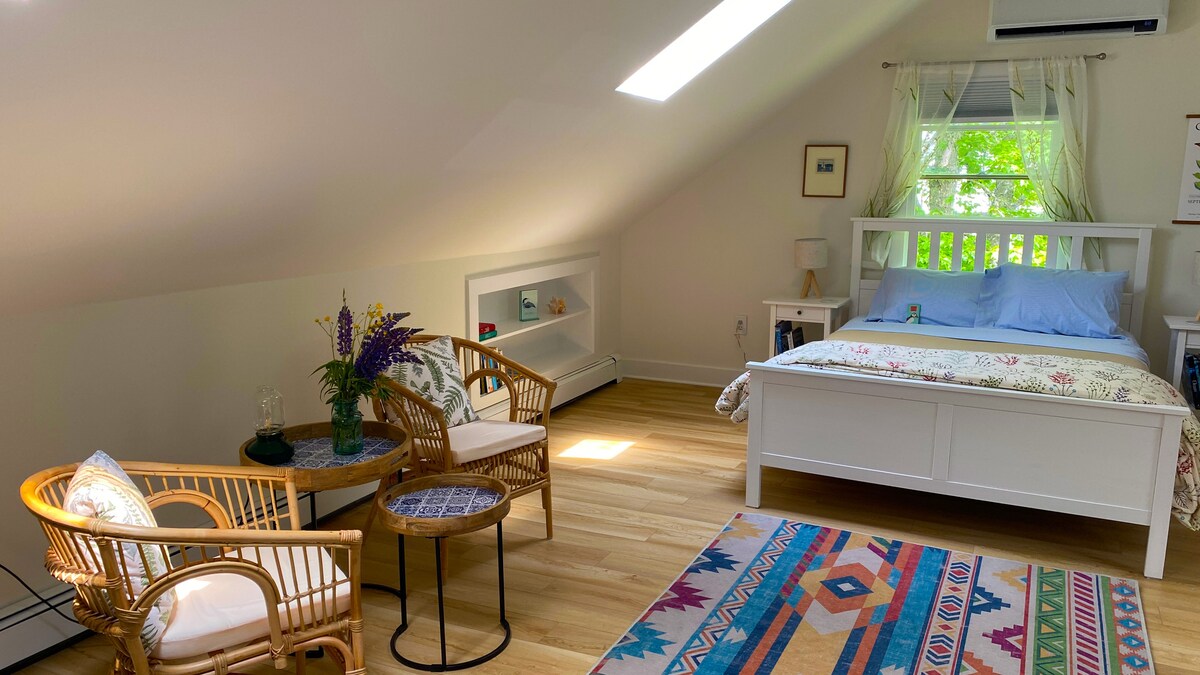 Sunny eco-friendly cottage on Route 1, steps from the beach! A cozy studio with a Murphy bed, a full bath, and kitchenette - stovetop, fridge, toaster, & microwave. Beautiful views of Penobscot Bay – don't worry, the blinds will keep the sunshine at bay when you need a nap! You're within easy walking distance of sandy beaches, restaurants, shops, a coffee roaster, and a market. Explore nearby hiking trails, Mount Battie, and the charming towns of Belfast, Camden, Rockport, and Rockland.