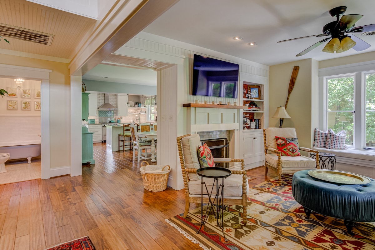 Blue Bird Bungalow. Visita y disfruta de este bungalow de 1921 completamente renovado y construido para la señorita Amy Glenn. La restauración mantuvo el encanto original de la cabaña bungalow, pero añadió diversión y comodidades modernas con encanto. Consta de tres dormitorios y tres baños. Dos con duchas de azulejos fabulosos y uno con la bañera original con patas restaurada maravillosamente. Cocina grande y muy funcional con cocina de gas de cinco estrellas, bloque de carnicero y encimeras de mármol. Chimeneas que funcionan.