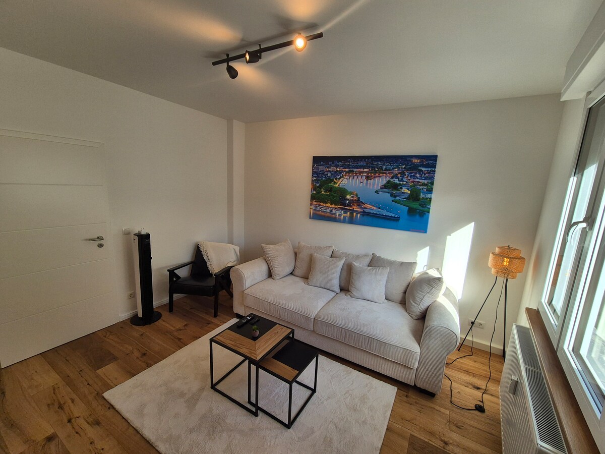 Apartamento de nueva construcción con muebles modernos, balcón y ascensor en el corazón de Coblenza. Vistas panorámicas a la Iglesia del Sagrado Corazón de Jesús. Al comienzo de la zona peatonal y a 2 minutos a pie del Löhrcenter. El casco antiguo, el castillo y la esquina alemana están a poca distancia a pie. El apartamento consta de una gran sala de estar con sofá cama (superficie de 1,20x1,90m), una cocina, dormitorio con cama boxspring (1,80x2,00m), balcón, baño con ducha a ras de suelo.