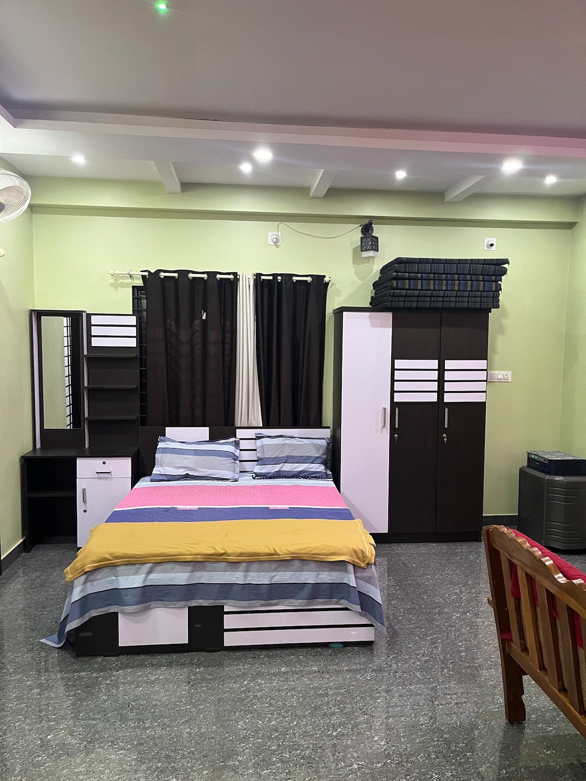 Amplio departamento, ubicado a 5 km del centro de la ciudad y adyacente a la Carretera Nacional (Kannur-Mangalore). El apartamento cuenta con 2,5 dormitorios, 2 baños, sala de estar y comedor, cocina con nevera, hervidor de agua , utensilios básicos y una placa calefactora, y un total de 4 camas. Solo un dormitorio tiene aire acondicionado y los demás tienen ventiladores de techo. Situado en el tercer piso con acceso al ascensor y amplio estacionamiento. Los restaurantes cercanos lo convierten en una opción conveniente para tu estancia.