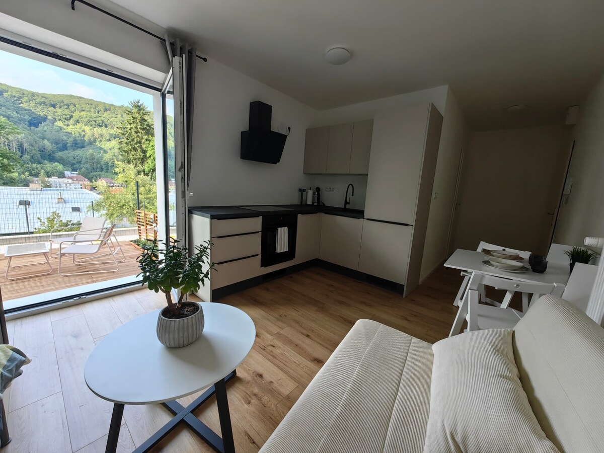 Apartmán s výhľadom na hrad a parkovacím miestom.