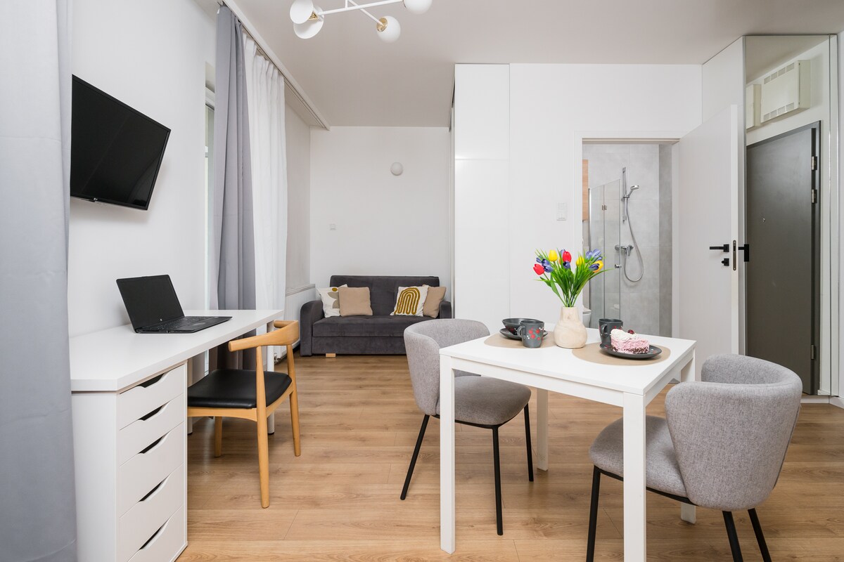 Un departamento cómodo y totalmente equipado con balcón, diseñado para estancias más largas en Cracovia. Una distribución bien pensada y un acabado moderno garantizan la comodidad diaria: una cocina empotrada funcional, una acogedora sala de estar con un sofá cama, un espacio de trabajo y un televisor inteligente. El balcón y las ventanas dan a un espacio verde y tranquilo, lo que te permite disfrutar de privacidad. Perfecto para personas que trabajan a distancia o que buscan un alojamiento cómodo durante unas semanas o meses.