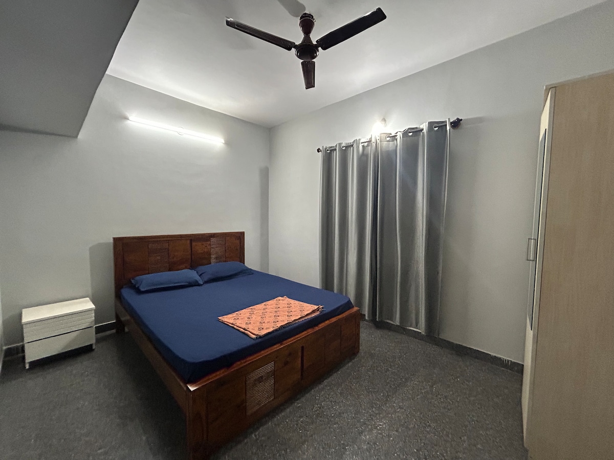 This independent studio is located on ground floor, it has private attached bathroom and kitchenette. The space opens out into a large garden, with mango and coconut trees. This property is located 1 km from the bus stop, supermarket and restaurants! It is part of a larger farm property, which has a few more Airbnb listings. AC available for extra charge: ₹300