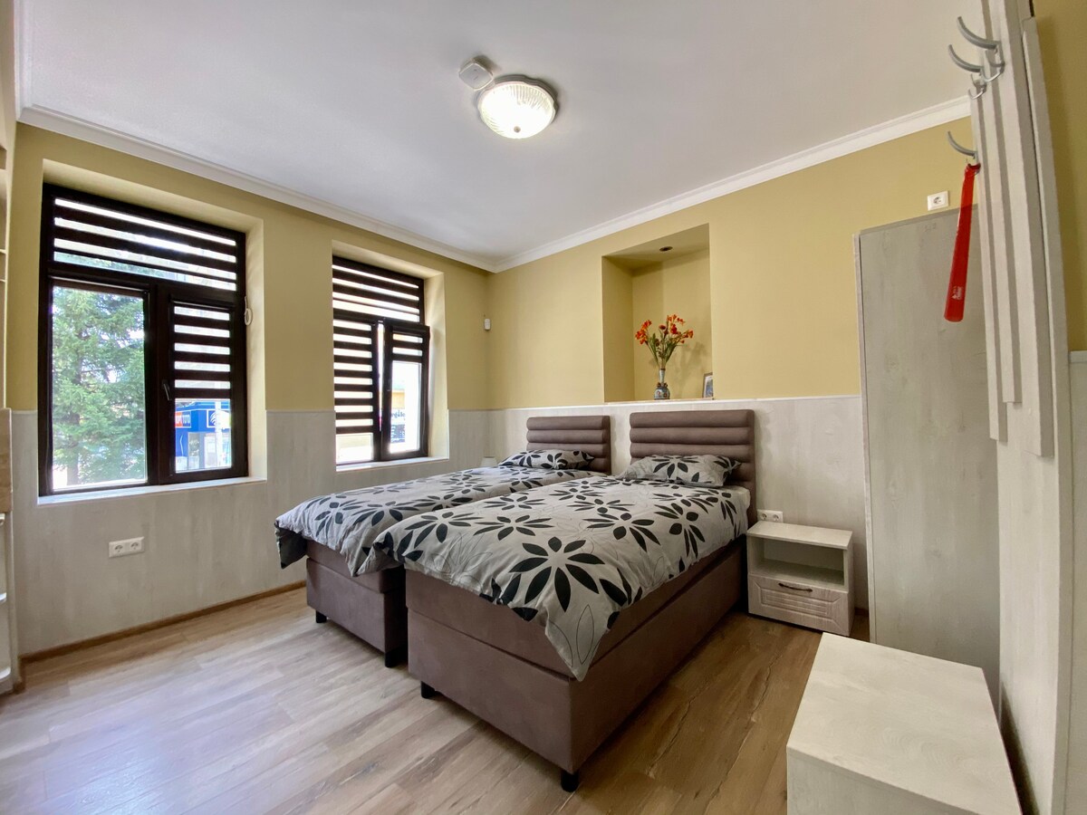 ¡Bienvenido a nuestro acogedor apartamento en el corazón de Shumen! Disfruta de la paz y la tranquilidad, a solo un paso del Monumento a Rusia, el jardín de la ciudad y a 10 minutos a pie de la estación de autobuses y la estación de tren. Consta de dos cómodas habitaciones equipadas con aire acondicionado y TV, cocina con todos los electrodomésticos necesarios, cubiertos y utensilios de cocina, WiFi y terraza con una vista maravillosa del parque. El apartamento es perfecto para familias, amigos y viajes de negocios.