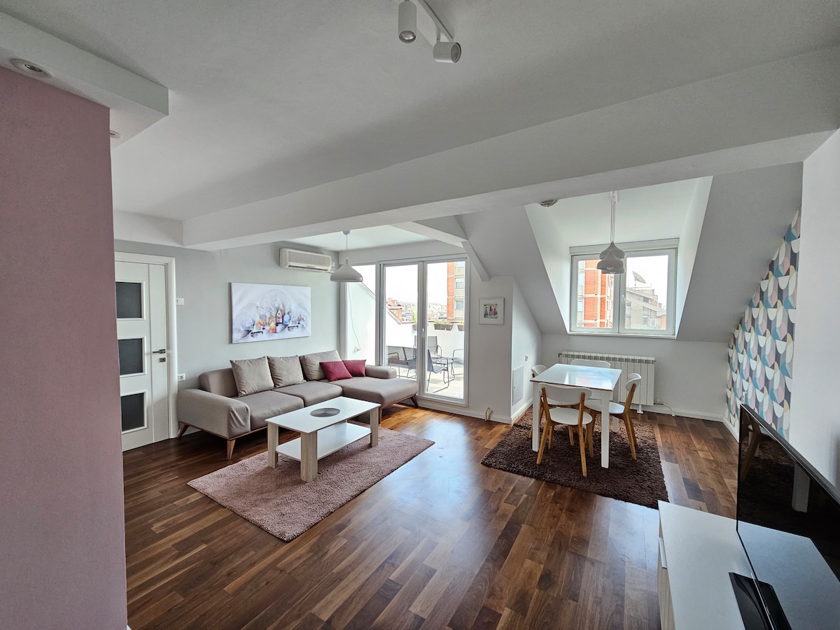 Disfruta de una experiencia de lujo en este céntrico alojamiento. Este es un apartamento NUEVO de 60 m2 a 5 minutos a pie del parque de la ciudad (estadio) y de la plaza principal. La mejor ubicación posible, muy cerca de las encantadoras calles de Debar Maalo con muchos bares y restaurantes. El apartamento tiene 1 dormitorio con cama tamaño queen y una sala de estar con un cómodo sofá cama + cama extraíble. También hay 2 balcones en ambas habitaciones, uno con vistas a la montaña Vodno. Puedes utilizarlo para tomar un café o almorzar.