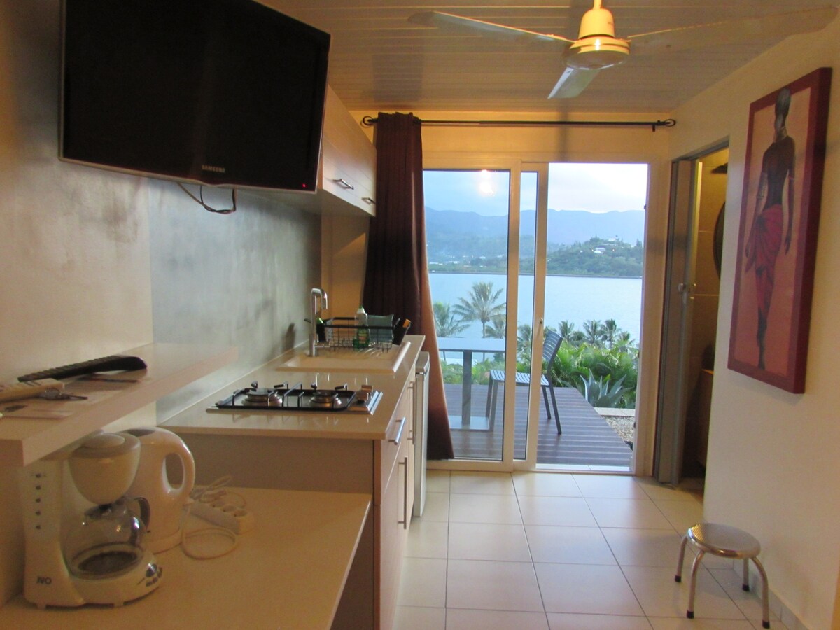 Venez vous détendre et vous ressourcer dans ce joli studio indépendant de 24 m² en bord de mer. Vous disposerez d’une chambre de 12 m² climatisée avec placard, une pièce de 12 m² avec salle d’eau/wc et meuble cuisine ainsi qu’une petite terrasse privée face au lagon pour prendre vos repas ou vous relaxer. Accès à une plage privée idéale pour la baignade et utilisation libre de 2 kayaks pour explorer les îlots. Également à disposition : masques, tubas et serviettes de plage pour le snorkling.