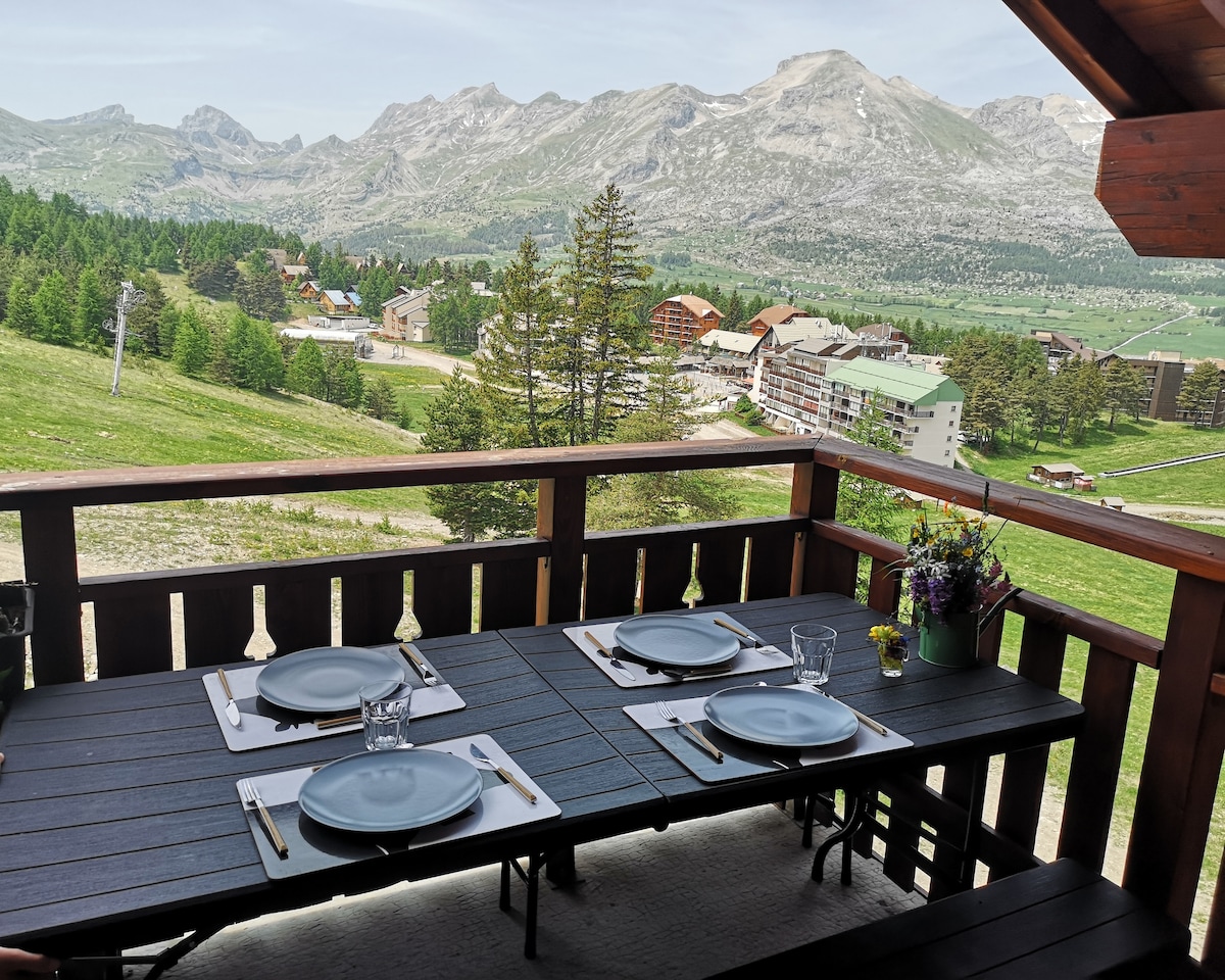 Le ofrecemos nuestro chalet familiar adosado en dúplex con vistas despejadas a las montañas. Los imprescindibles: + un refrigerador de 2 puertas con congelador ++ un verdadero horno de calor giratorio +++ una vista despejada de las cumbres ++++ lo haces todo a pie con el corazón de la estación a 200 m y el frente de nieve a 300 m Situado en la residencia Flocons du Soleil con piscina cubierta climatizada y sauna a 300 m del frente de nieve.