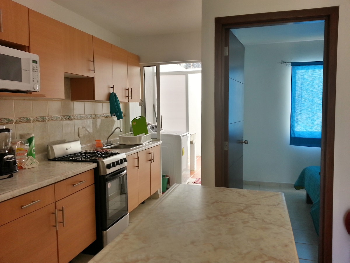 - Acogedor y exclusivo estudio ejecutivo con cama queen-size, escritorio y aire acondicionado. - Balcón para tomar aire fresco. - Cocina equipada. - Ingreso con cerradura inteligente y clave personalizada y exclusiva para cada huésped. - Rooftop panorámico con restaurante en el nivel 9. - Sala de juntas equipada para reuniones profesionales (consultar disponibilidad). - Acceso 24/7 con código personalizado. IMPORTANTE: No contamos con estacionamiento privado dentro de la propiedad.