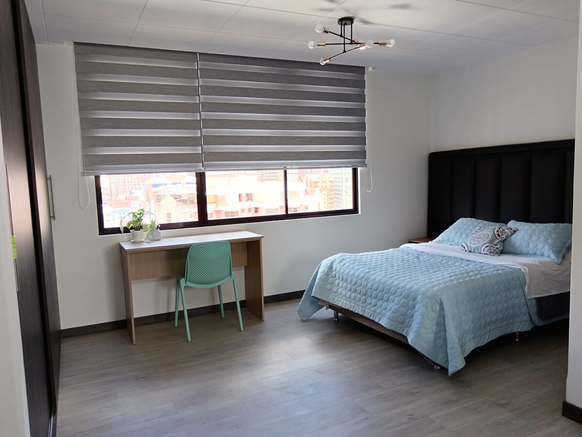 Penthause exclusivo con vista panorámica inigualable del "Illimani" y la ciudad. - Ubicado en el corazón de Sopocachi, cerca de supermercados, restaurantes y trasporte público. - Wifi 5G - Cocina independiente, Nexflix, lavadora y agua caliente. - Acceso seguro y privado con ascensores panorámicos y seguridad 24/7 1. Habitación principal cama QUEEN para 1 o 2 personas Dólares 38 (la segunda permanece cerrada) 2. Segunda habitación (opcional) cama doble disponible por 10 dólares por persona.